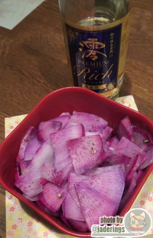 遅ればせながらあけおめです。 年末買ったタツ…もとい紅芯ノポポダイコンは、蜂蜜を足したフレンチドレッシングでマリネにしました。お年始のお酒はミオちゃんスパークリングです。 #ゼノブレイド3 #神ゲー2022 twitter.com/jaderings/stat… pic.twitter.com/BJgMHMxYgs