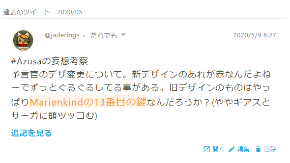 「黒」と「翠」と共にあるもの、というTL上でのアルヴィース君の話(※ネタバレ忌避しないので見ちゃってる)に対し、DE紹介プロモでアルヴィース君の鍵型アクセサリーが「赤」に置き換わった事で、「ああ、これなのか」というところに、なんだか合点がいったのです。
