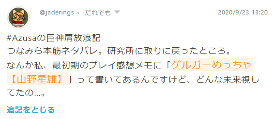 ふせったーの中身はクッションの下!#Azusaの巨神肩放浪記 つなみら本筋ネタバレ。研究所に取りに戻ったところ。 なんか私、最初期のプレイ感想メモに「○○○○○○○○○○○○○○」って書いてあるんですけど、どんな未来視してたの…。 fse.tw/QsM91DzZ#all
