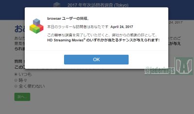 おお、初めて来たぞ、謎のスパムアンケート割り込みon the Chrome。これが噂の奴ですか。ふーん(即閉じ) それはいいんだが。 さっきまで入力していた生協の注文作業時間を返してくれ(怒)。 注文番号ミスったーって、人がチラシで番号再確認してる隙に画面すり替えおって。 pic.twitter.com/0gzdeq4Ovo