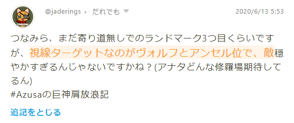 いつものようにふせったー用クッションおいときますね。つなみら、まだ寄り道無しでのランドマーク3つ目くらいですが、○○○○○○○○○○○○○○○○○○○○○○○穏やかすぎるんじゃないですかね?(アナタどんな修羅場期待してるん) #Azusaの巨神肩放浪記 fse.tw/xbw4nJd1#all
